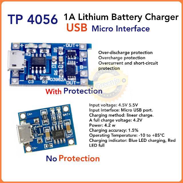 Harga Modul Charger TP4056 Lithium Battery 18650 with protection. Harga Modul Cas Lithium 18650 Micro USB TP4056 Charging Charge Protection. Apabila led berwarna hijau menyala mengindikasikan bahwa baterai sudah penuh.